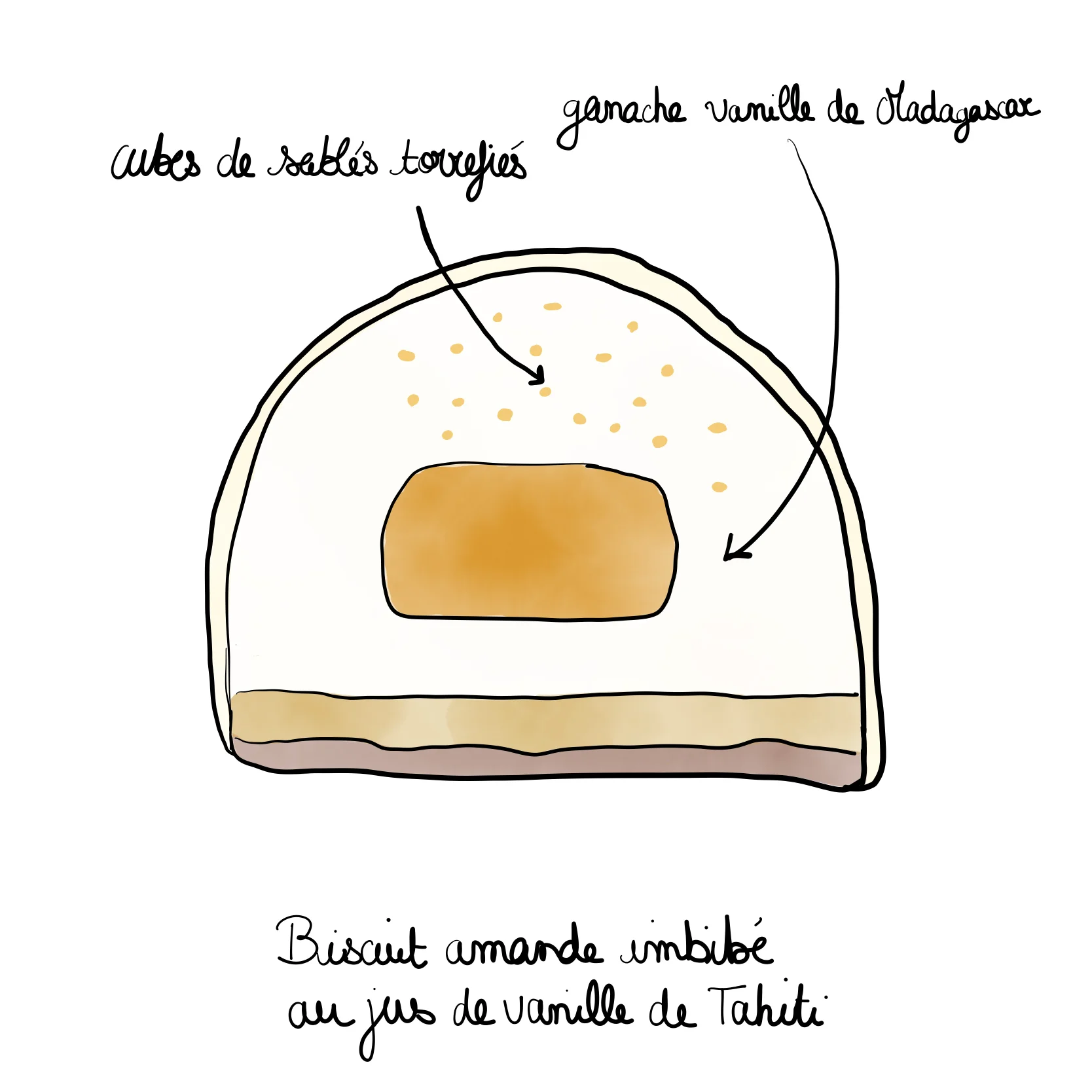 Composition :Biscuit Joconde, chantilly vanille, biscuit amande imbibé au jus de vanille, ganache vanille, cube de pâte sucrée caramélisée