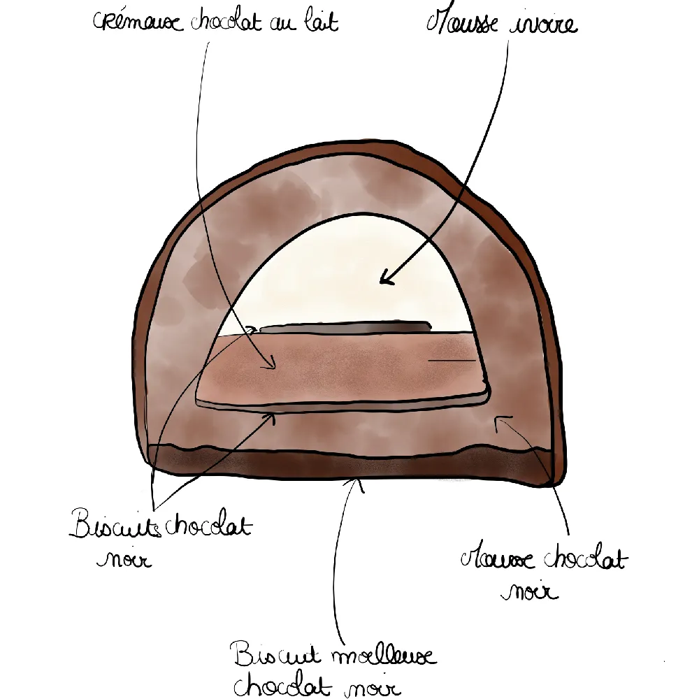 Composition : Biscuit macaron chocolat, ganache chocolat aux éclats de caramel beurre salé, mousse au chocolat, fines tranches de chocolat à la fleur de sel