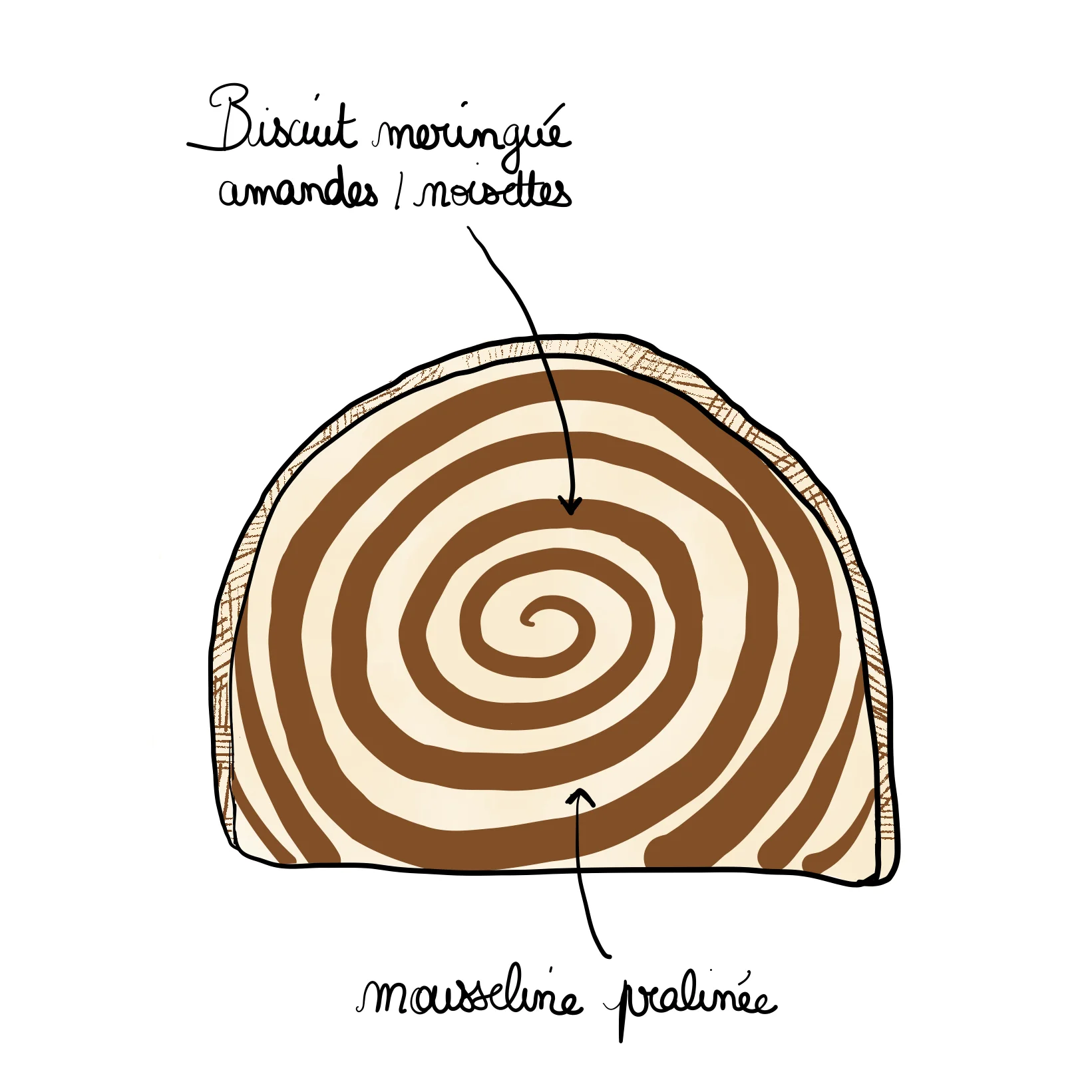 Composition : Biscuit meringué, amandes et noisettes, mousseline pralinée.