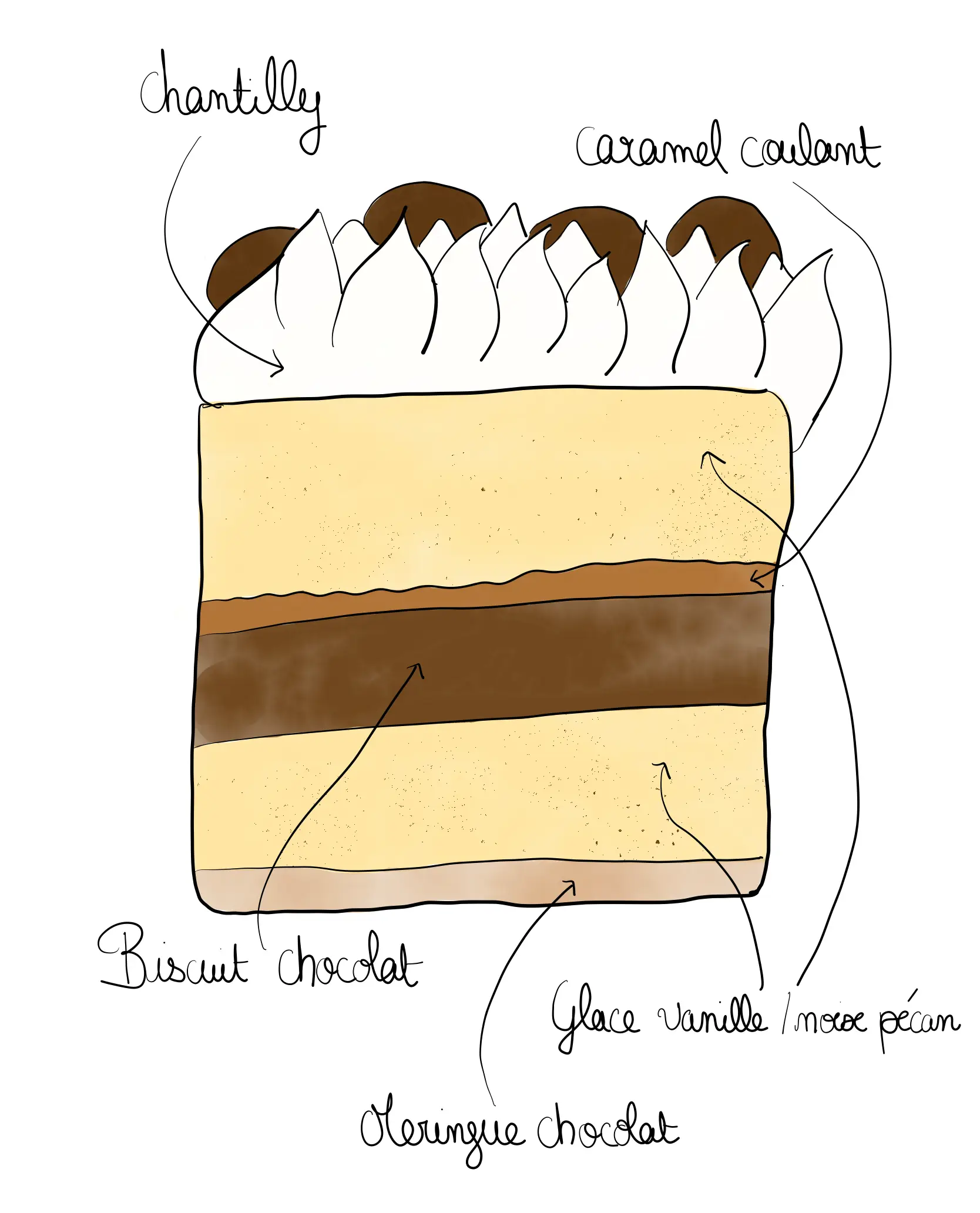 Biscuit chocolat, meringue de chocolat, glace vanille noix de pécans caramélisées, caramel coulant, chantilly, sphères de glace au chocolat (décor)